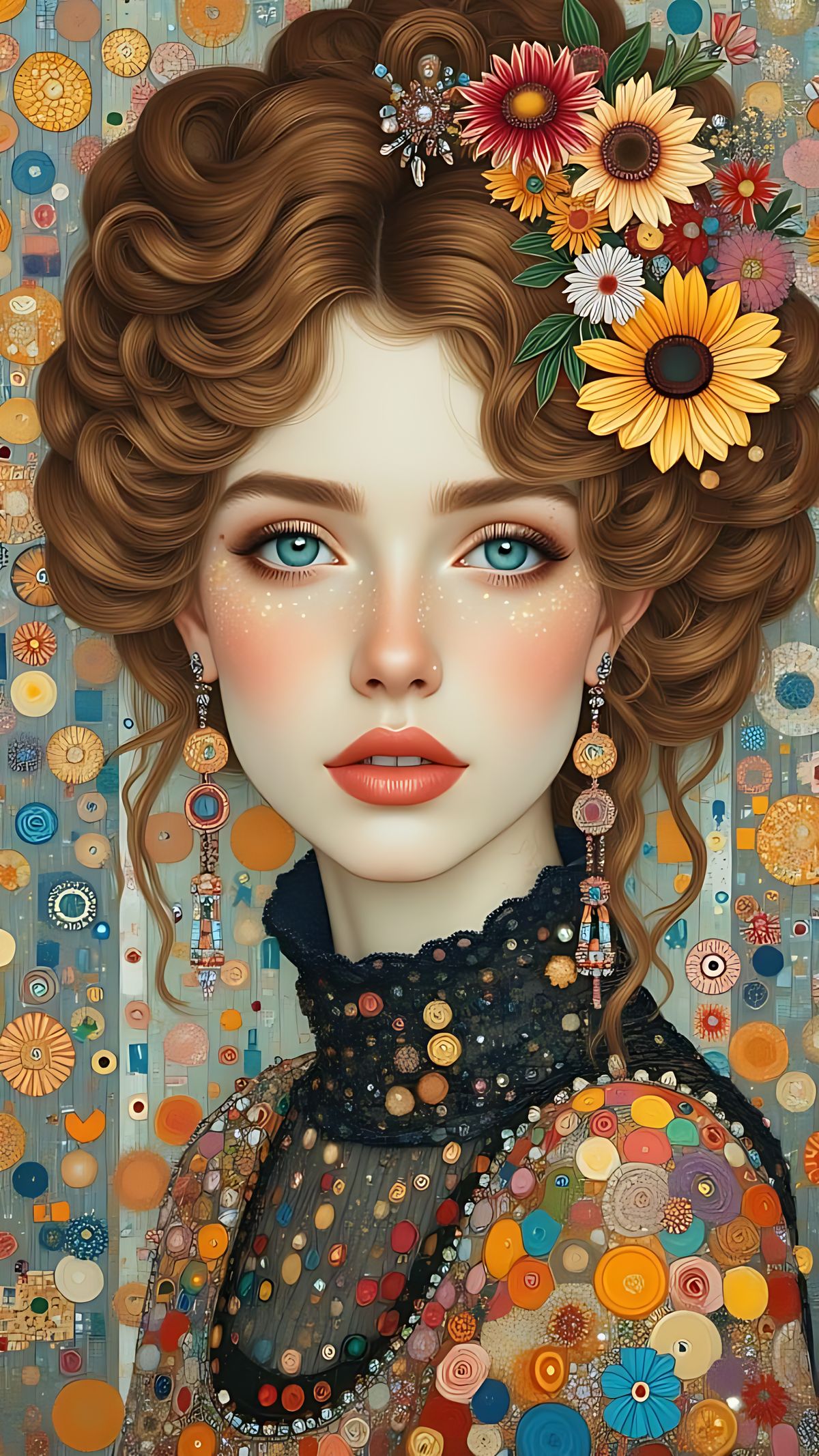 This image is a photorealistic portrait of a woman, reminiscent of Gustav Klimt's style, with intricate details and harmonious colors, capturing a cinematic and atmospheric mood.
