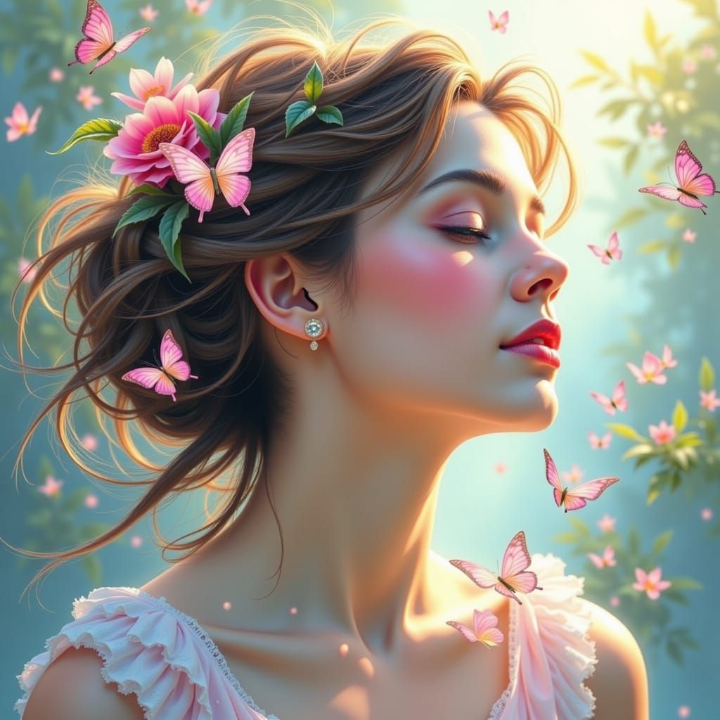 A serene woman adorned with flowers and butterflies. This image captures an ethereal and dreamy atmosphere reminiscent of impressionist paintings, featuring soft brushstrokes and pastel colors.