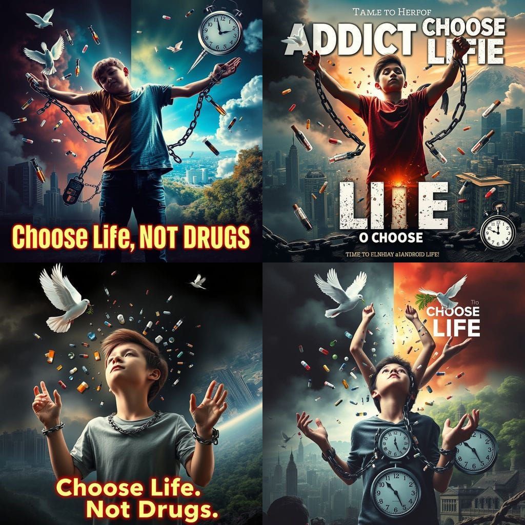 This image shows a poster design for a drug abuse awareness campaign. It depicts a person breaking free from chains, set against contrasting backgrounds of a chaotic city and a bright, nature-filled world. Symbolic elements include a dove and helping hands.