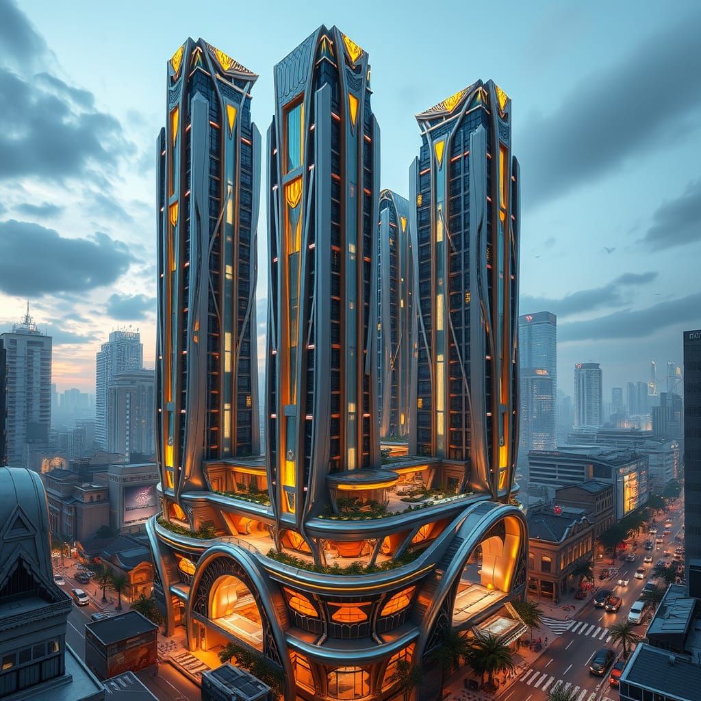 This image depicts a futuristic, metallic tower village in Bangkok, blending traditional Thai aesthetics with sleek modern architecture, featuring intricate carvings, golden accents, and luxurious water features, evoking a sense of grandeur and wonder.