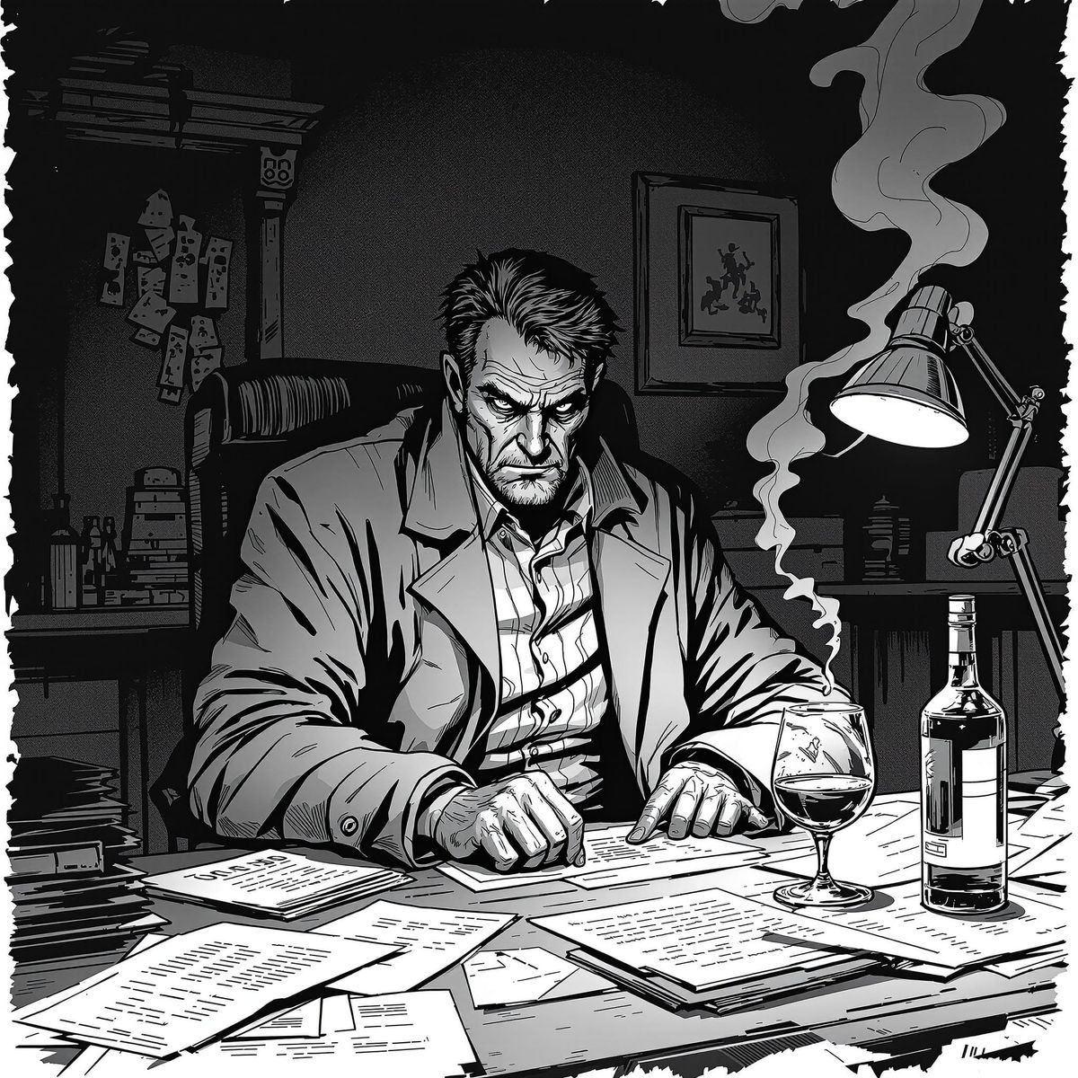 This image shows a private investigator in a smoky, dimly lit room filled with case files and whiskey. It's a gritty, black and white comic illustration capturing classic noir atmosphere.