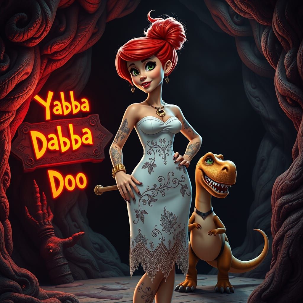 This image shows a striking, gothic take on Wilma Flintstone, set in a mystical, high-fantasy world with intricate details and rich colors. A female figure stands with one hand on her hip, holding a club, adorned with vine tattoos and a dinosaur necklace, against a dark backdrop with an ornate cave in th...