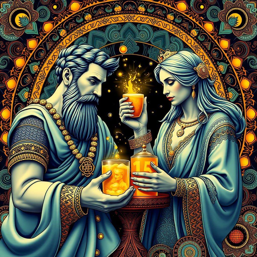 This image depicts a pair of triumphant men and women proudly holding golden trophies, symbolizing achievement and success in a colorful vector illustration style, blending abstract and fractal elements with 3D shading effects.