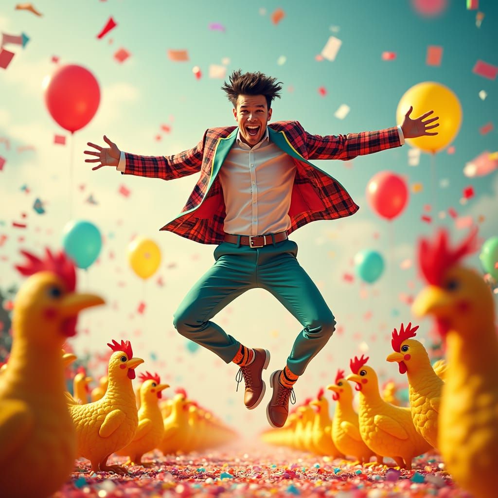 A vibrant portrait of a consultant surrounded by rubber chickens, confetti, and balloons, set against a stylized, gradient background evoking global connectivity and Japanese culture, radiating joy, creativity, and limitless possibility