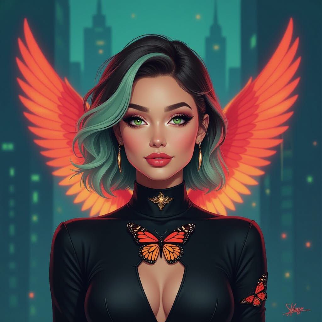A digital painting of a woman with green hair and phoenix wings against a futuristic cityscape. This image captures a cyberpunk aesthetic with intricate details and a high-gloss finish.