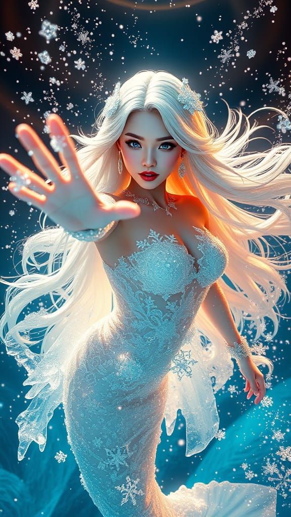 A mesmerizing portrait of a high-fashion model as an ice mermaid queen. Set in a glacial underwater realm, she exudes confidence amidst floating ice shards and glittering snowflakes in an ethereal, frozen fantasy atmosphere.