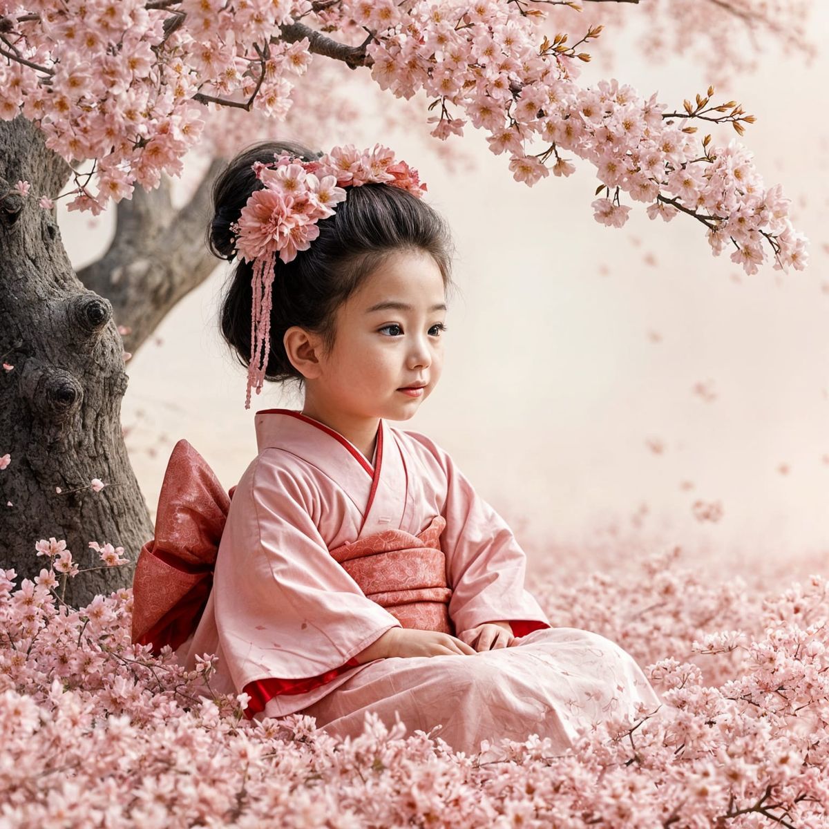 This image shows a two-year-old Japanese girl in geisha attire sitting among cherry blossoms. The artwork features delicate brushstrokes, soft pink hues, and gentle lighting, reminiscent of traditional Japanese watercolor art.