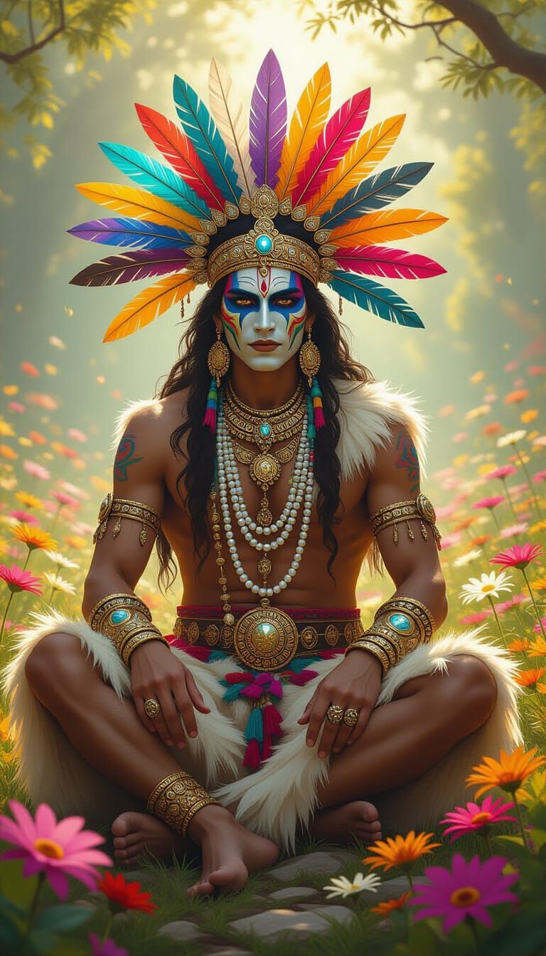 A radiant shaman deity with painted features sits in a vibrant, sunlit garden. Adorned in animal skins and jewelry, with a mask and a crown of shimmering feathers. Fantasy art style with luminous lighting.