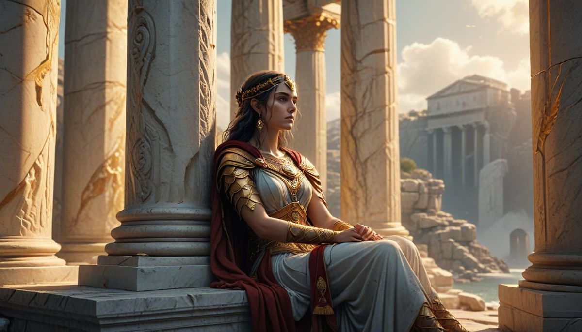 A hyperrealistic image of a beautiful young Greek woman in traditional clothing sitting before a monument. This digital painting features intricate detail and dramatic lighting.