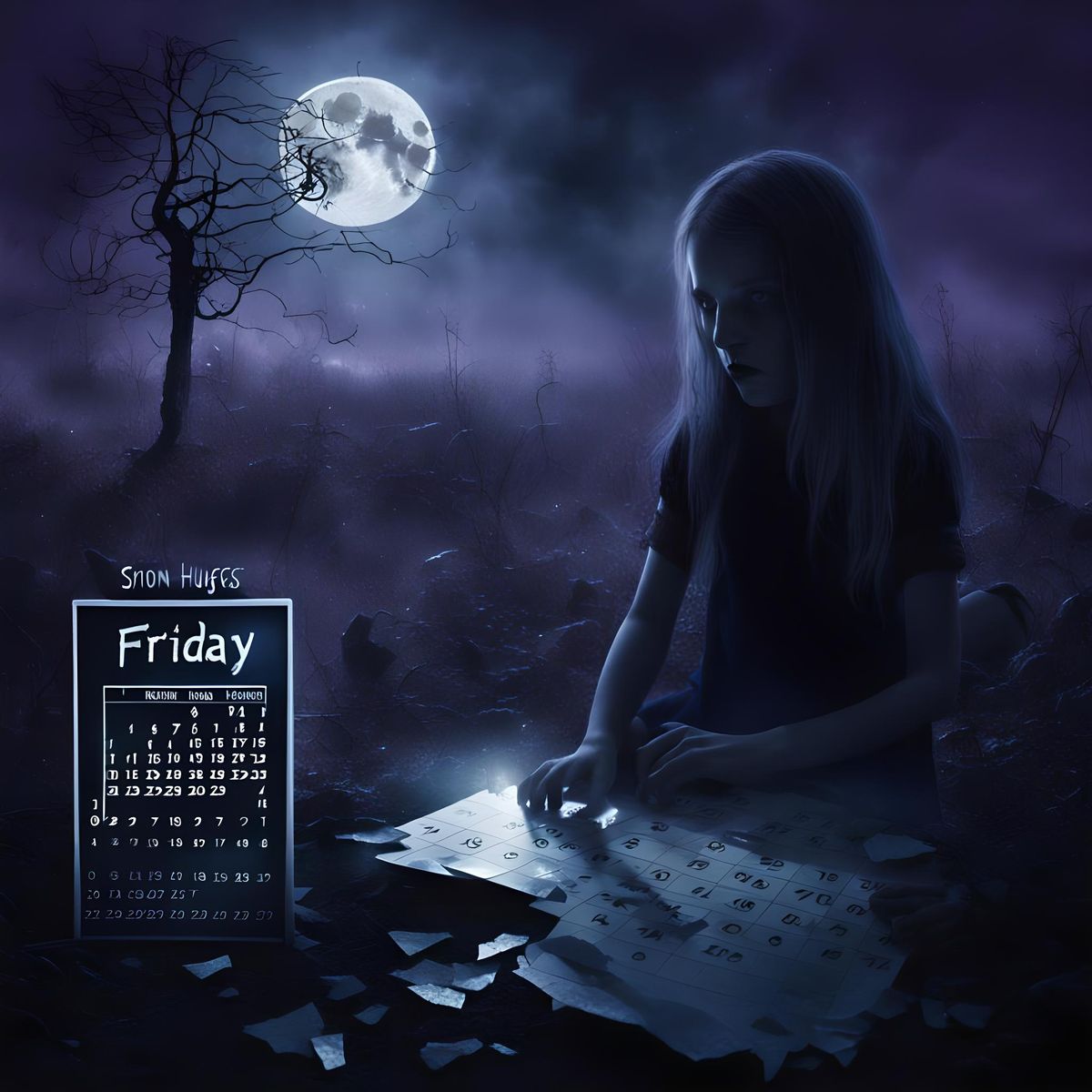 This image shows a shattered mirror reflecting a full moon, with a calendar displaying "FRIDAY 13". The scene evokes a sense of foreboding and superstition.