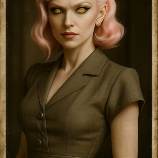 This image shows Chronoa, the Supreme Kai of Time, in a vintage 1940s photograph. She has pink hair and yellow eyes, wearing an elegant dress in a photorealistic style with film grain.