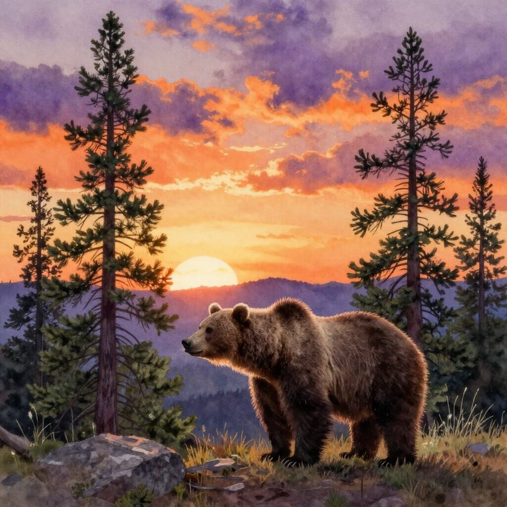 This image shows a solitary grizzly bear in the Rocky Mountains at sunset. Painted in an atmospheric watercolor style, it captures the quiet introspection of nature with vibrant colors and dynamic lighting.