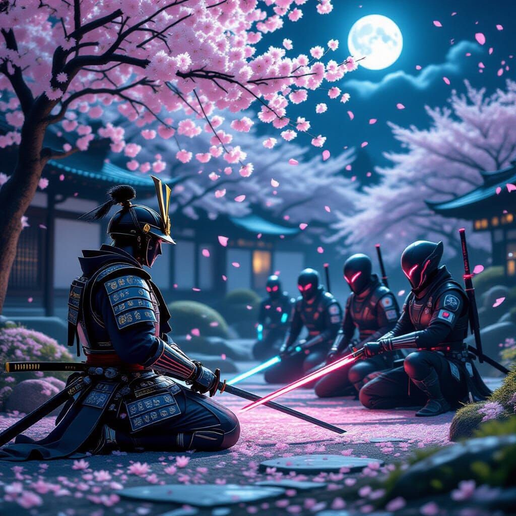 A lone samurai in traditional armor confronts cyber ninjas with neon blades under a moonlit cherry blossom garden, blending ancient tradition with futuristic technology.