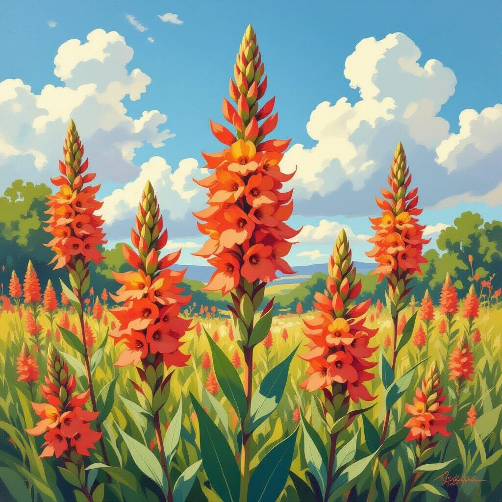This image shows a colorful garden filled with Indian Paintbrush flowers. The red and orange petals are set against a bright blue sky with clouds, in a watercolor style.