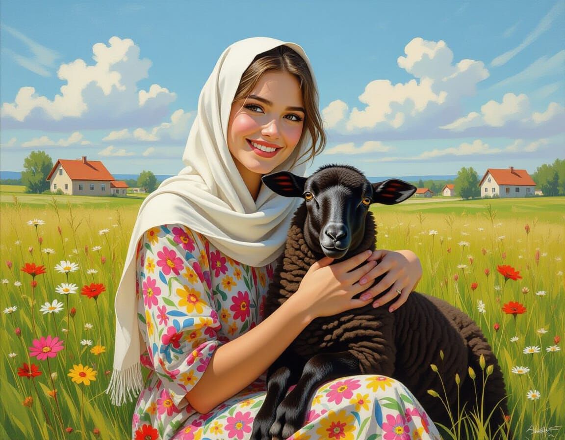 This image shows a fair-skinned woman with brown hair in a patterned dress and headscarf, holding a black sheep. The scene features a grassy field, wildflowers, and houses under a bright blue sky.