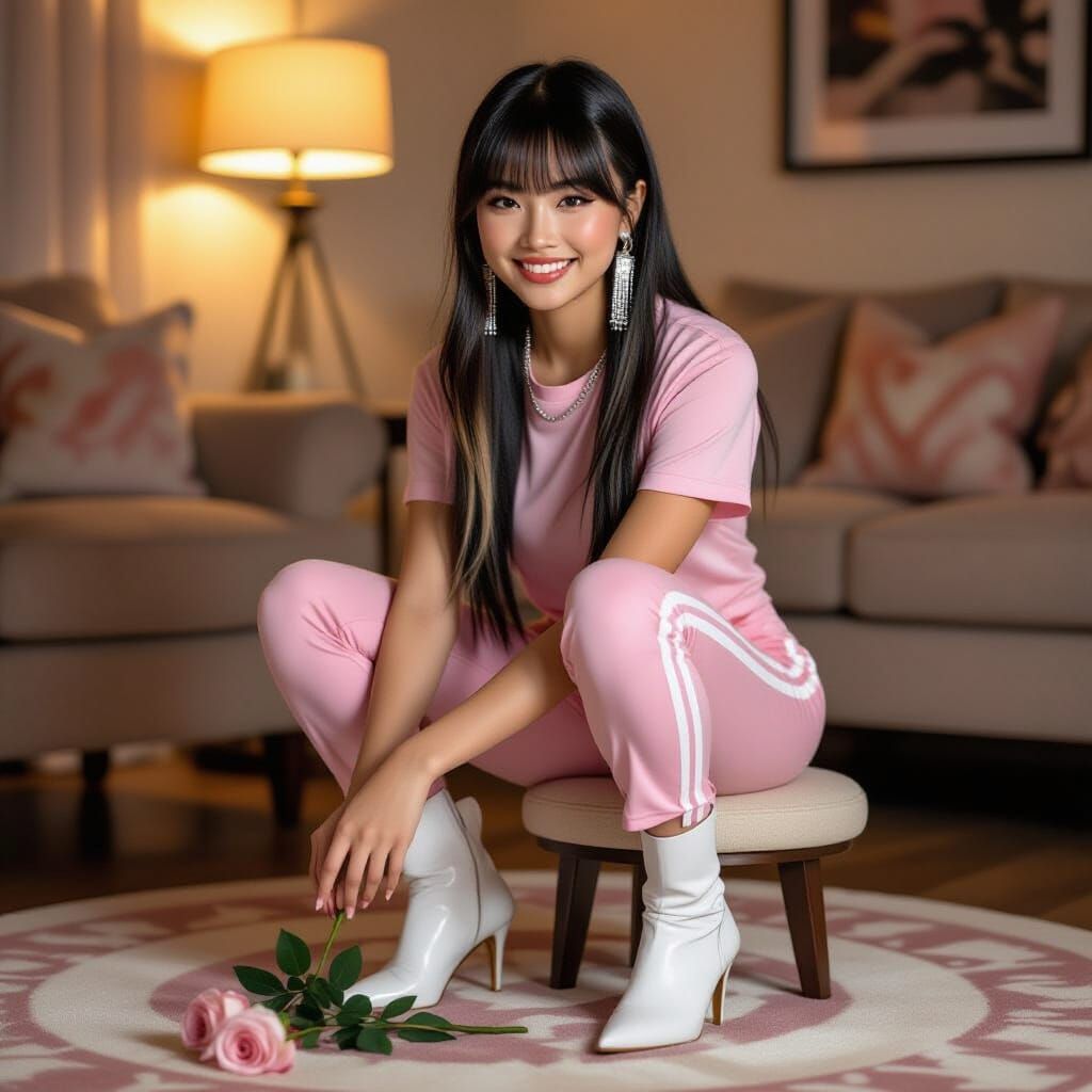 A photorealistic, full-body shot of a smiling Asian teen squatting to pick a rose. Features golden hour lighting and cinematic detail, showcasing her fashion and surroundings.