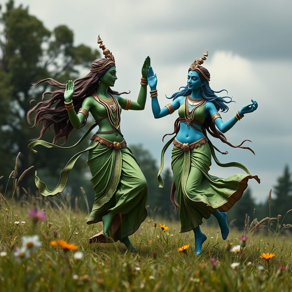 This image shows two Buddhist goddesses, Green Tara and Blue Tara, dancing together in a lush meadow. The scene is rendered in photorealistic detail, with vivid colors and textures.