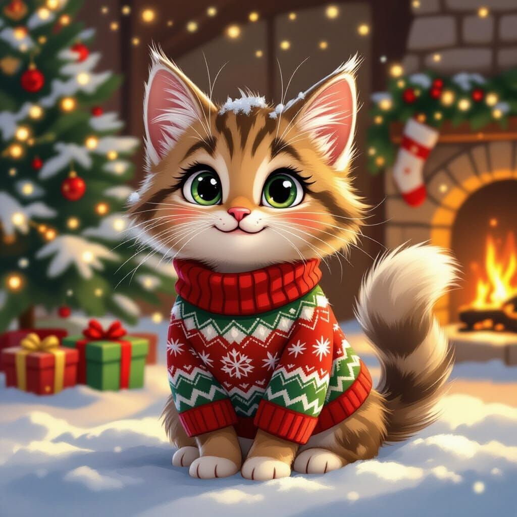 This image shows a charming cartoon cat in a cozy indoor setting, wearing a Christmas sweater. Features warm lighting, a decorated tree, and a fireplace glow, rendered in a vibrant, illustrative children's book style.
