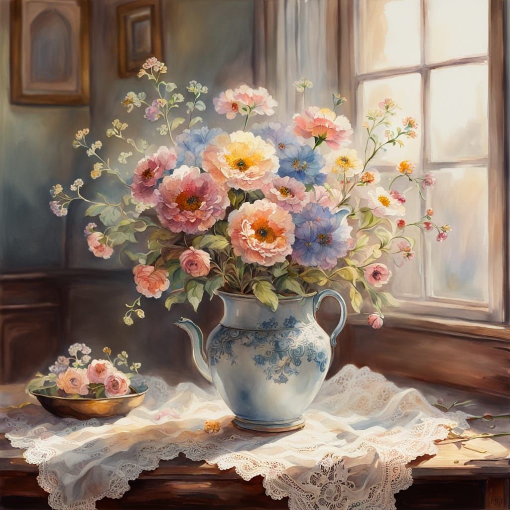 A watercolor painting of a flower bouquet in a pot on a table. The artwork features soft pastel colors, delicate mist, and warm golden light, rendered in a dreamy, serene style.