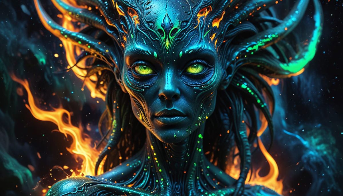 A digital close-up of an alien goddess engulfed in flames. Her ethereal form glows with blue and green bioluminescence against a dark cosmic backdrop in a graffiti art style.