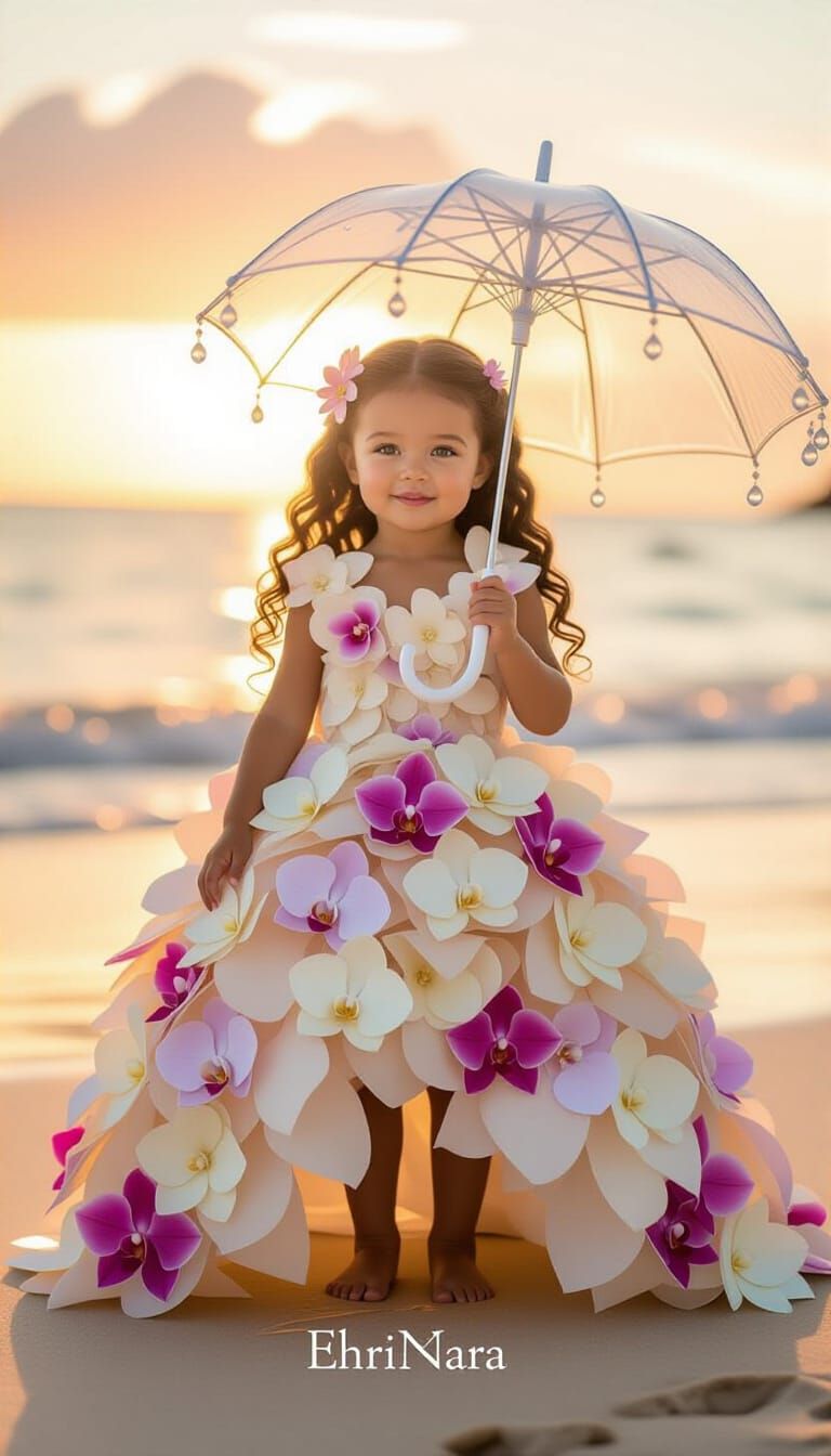 This image shows a toddler girl in a gown made of realistic flower petals on a glowing beach during a golden sunset. The scene features magical sparkles and cinematic lighting, rendered in a Pixar-meets-photo-realism style.