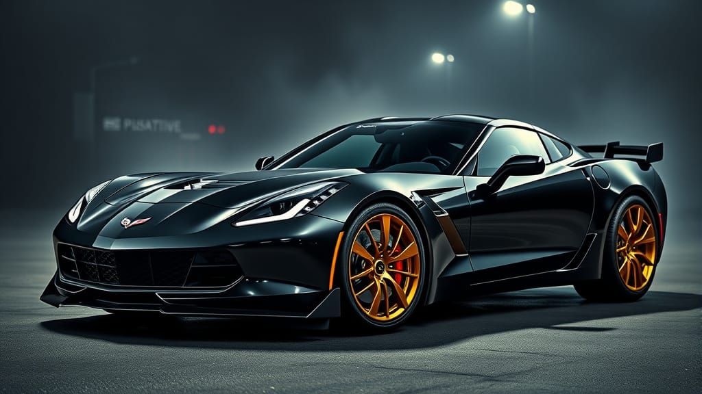 A striking picture of a black Corvette muscle car with gold alloy wheels in a cinematic scene. The image exhibits photorealistic detail and a moody, atmospheric tone, as 8k HDR photography.