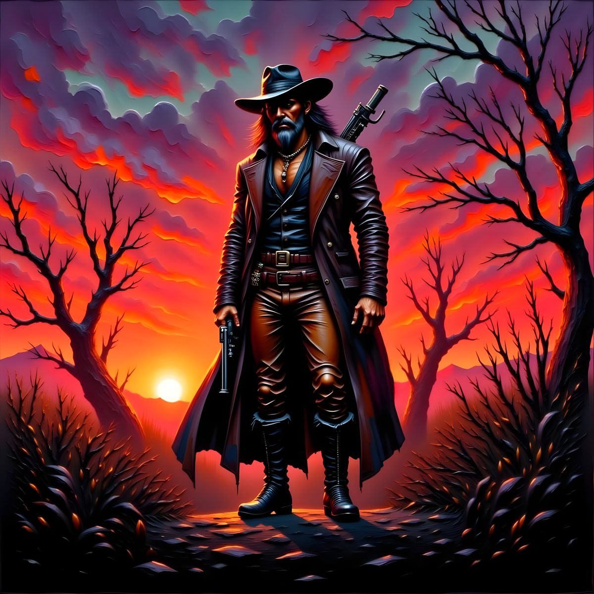 A dramatic image of a weathered gunslinger silhouetted at sunset. Stark shadows, bold lines, and a gritty aesthetic evoke a dark fantasy western comic vibe with muted, earthy colors.