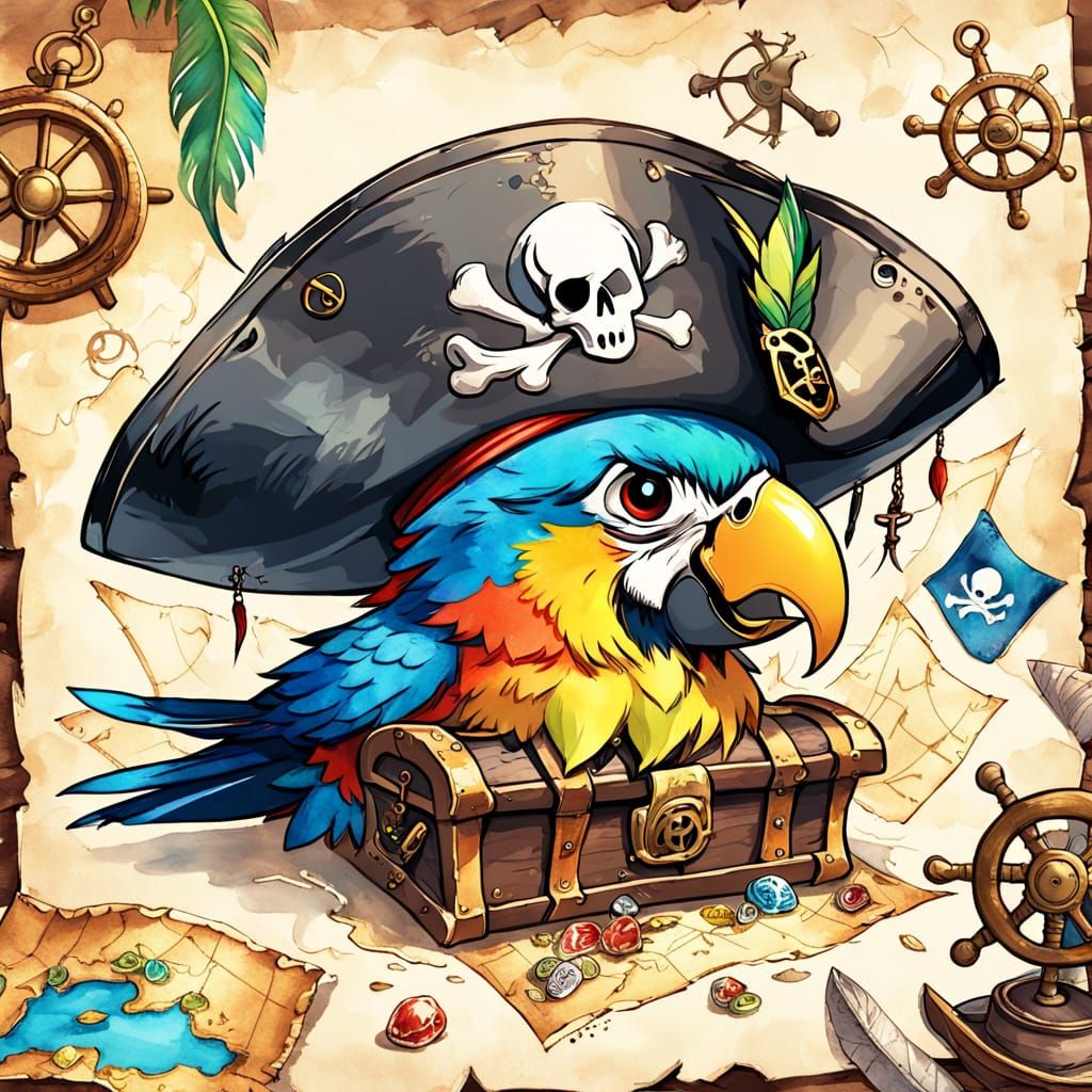 A watercolor sketch of a pirate's hat and parrot on a vintage-inspired treasure map, surrounded by treasures and nautical elements, with a dreamy, ethereal quality and expressive brushstrokes.