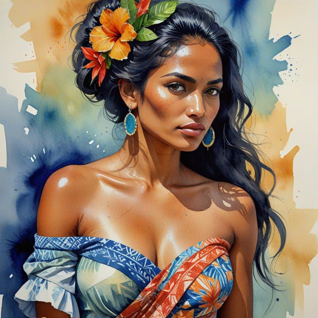 A vibrant watercolor painting of a Tahitian woman wearing European clothing, blending traditional and modern elements in a beautiful abstract art piece with a focus on complementary colors and fine details.