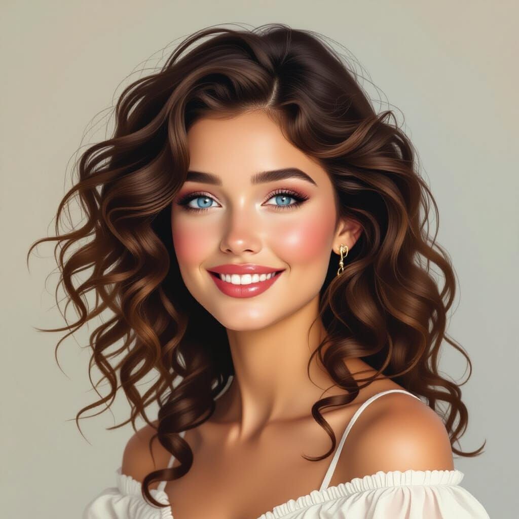 A striking picture of a young fair-skinned woman with curly brown hair and blue eyes. The portrait features radiant, photorealistic details and cinematic lighting reminiscent of an early 20th-century painting.