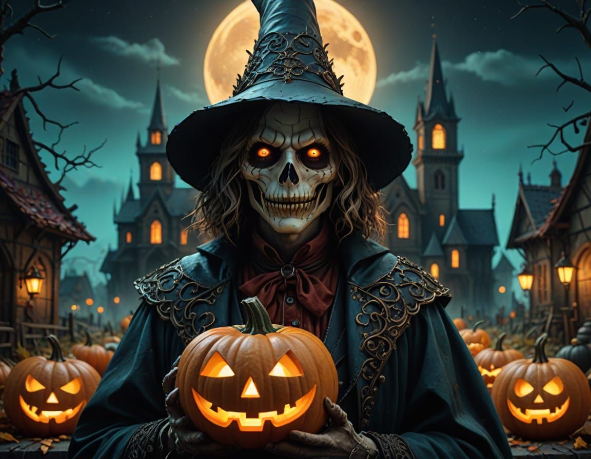 A surreal double exposure gothic oil painting featuring crumbling cathedral ruins and a hollow-eyed scarecrow phantom. Flickering lanterns illuminate the scene under a blood-red harvest moon with vibrant orange and teal colors.