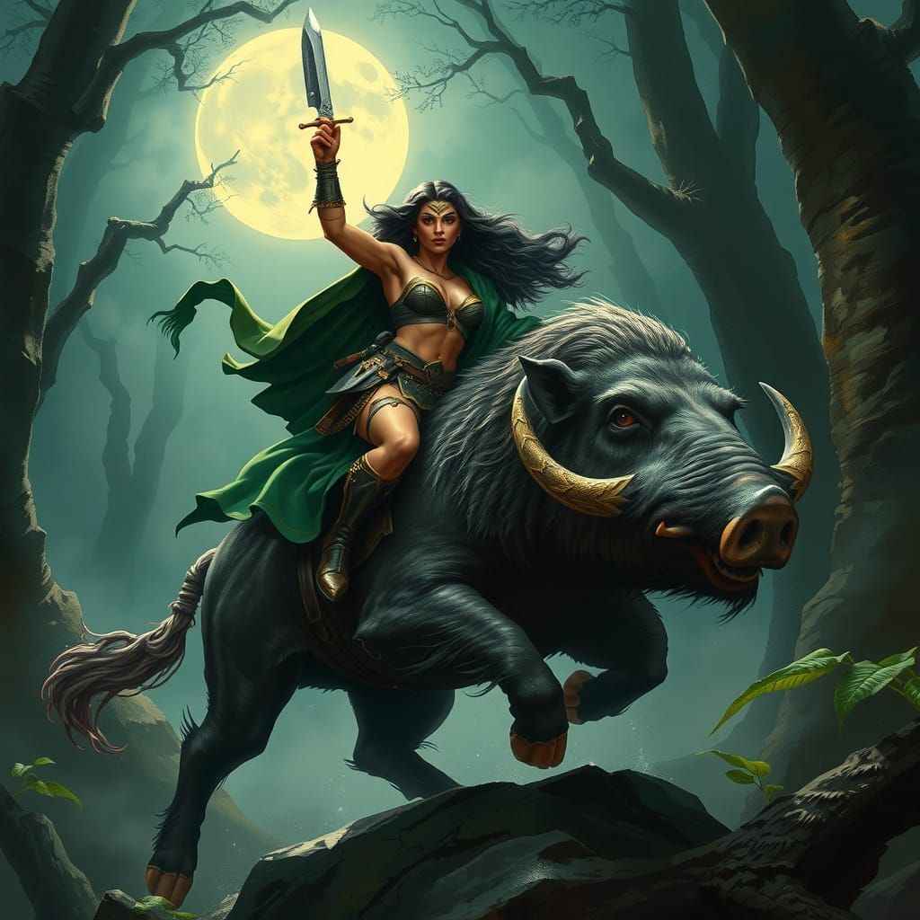 A dynamic illustration of a fierce Amazon warrior riding a wild boar through a misty forest. The artwork features dramatic lighting and intricate details reminiscent of surrealist fantasy art.