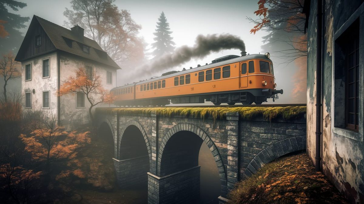 This atmospheric image captures a vintage yellow train crossing a moss-covered stone viaduct in a misty autumn forest, evoking a sense of enchantment and mystery in a worn, historic European town.