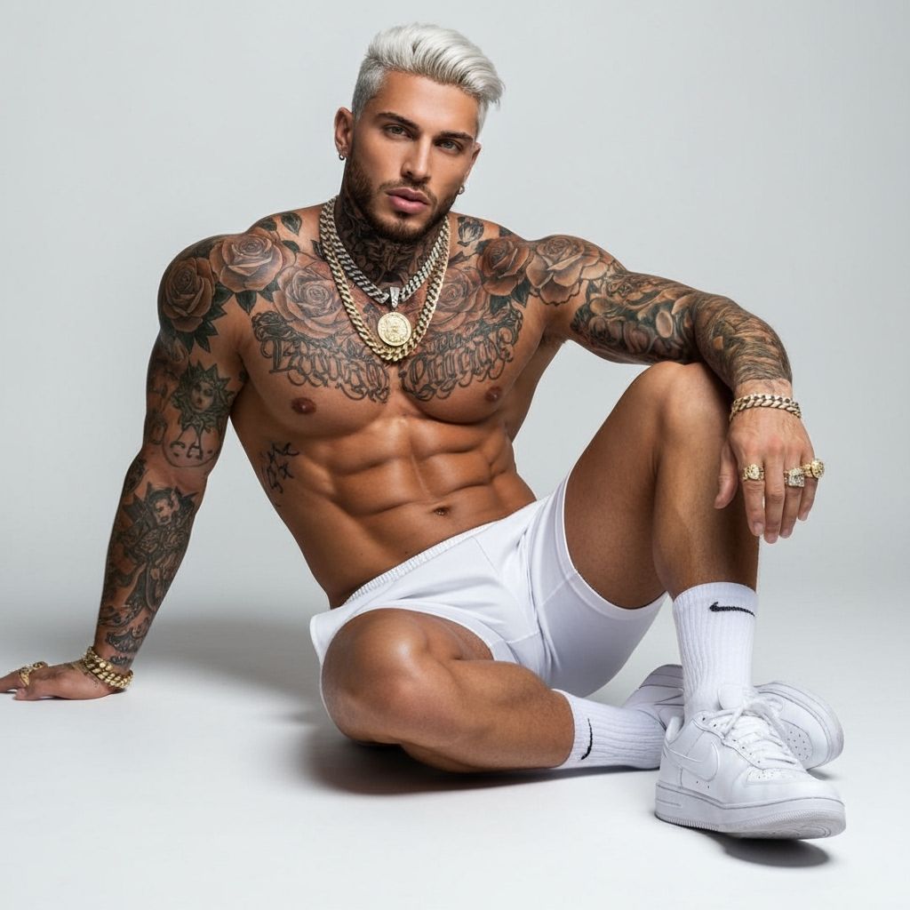 This image shows a muscular male model with tattoos sitting in a studio. The man has platinum blonde hair, brown eyes and a short beard. He is adorned with gold jewelry and is wearing athletic shorts.