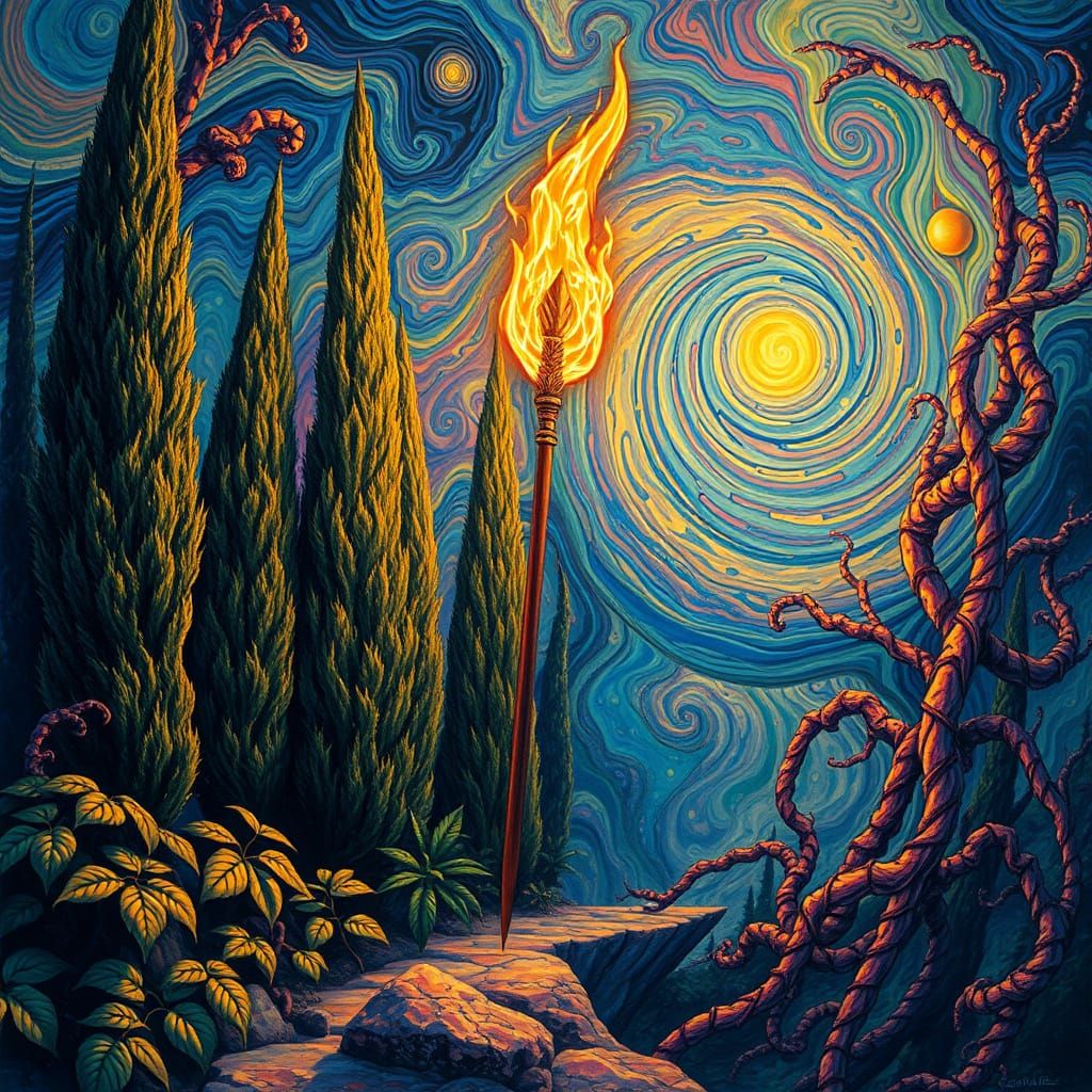 This image shows a surreal, psychedelic scene of a burning spear surrounded by vibrant, glowing cypress trees and iridescent vines in a dreamlike, impossible geometry world, reminiscent of surrealist art and M.C. Escher's works