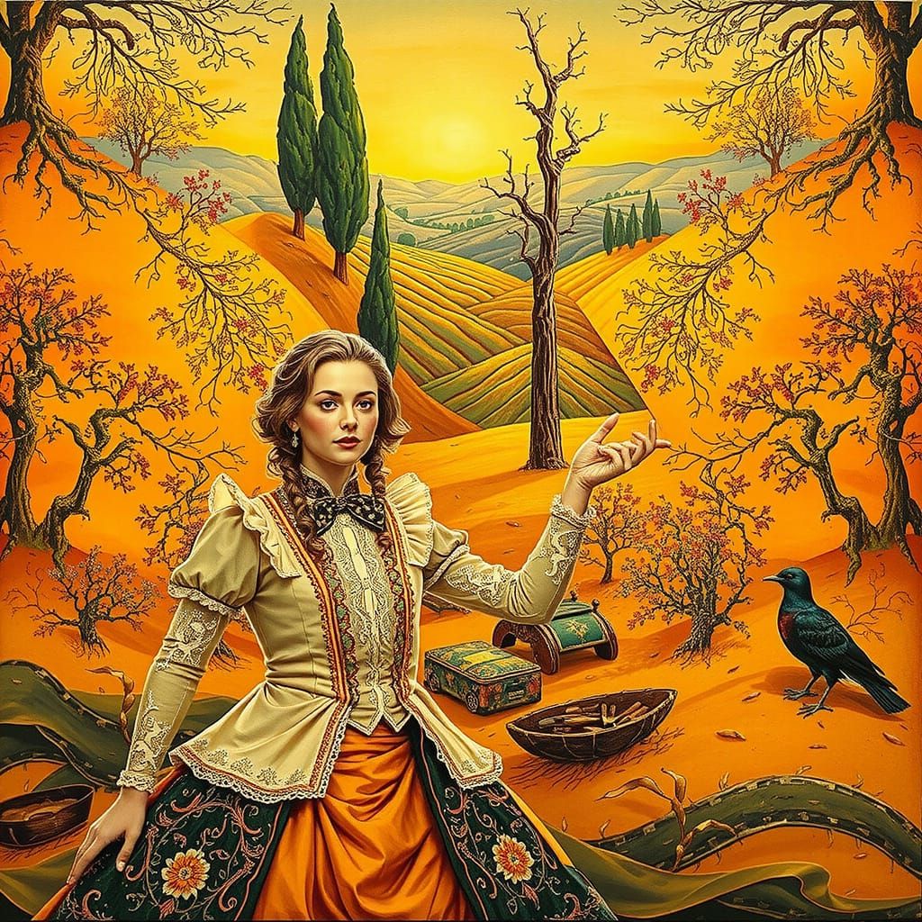 A picturesque scene of a figure in elaborate period attire amidst a tranquil, idyllic French landscape. The image features photorealistic details, gentle lighting, and a muted color scheme.
