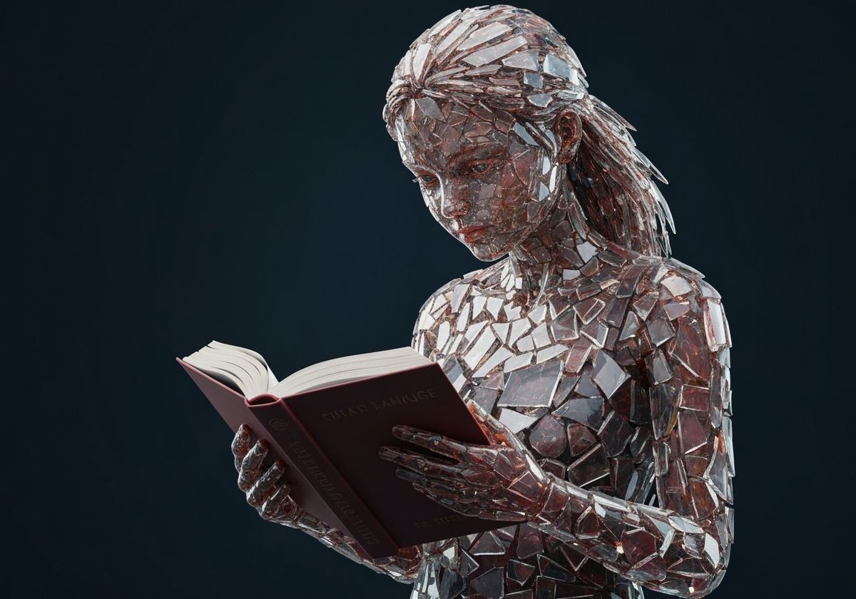 This image shows a girl constructed from glass fragments absorbed in reading. The artwork features a vibrant color palette and is rendered as detailed 3D digital art.