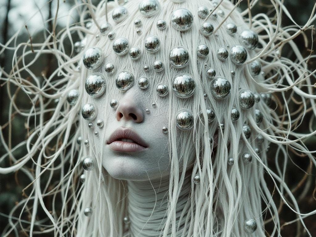 she's hollow mirrors on nature mock her embodied ivory-white hair like scaffolding holds a series of recursive wild mirrors climbing up and around her bunched hair-strands in layered hollowness reflecting the futility of right now pull back into a wide angle wild angle full-length long shot mirroring ...