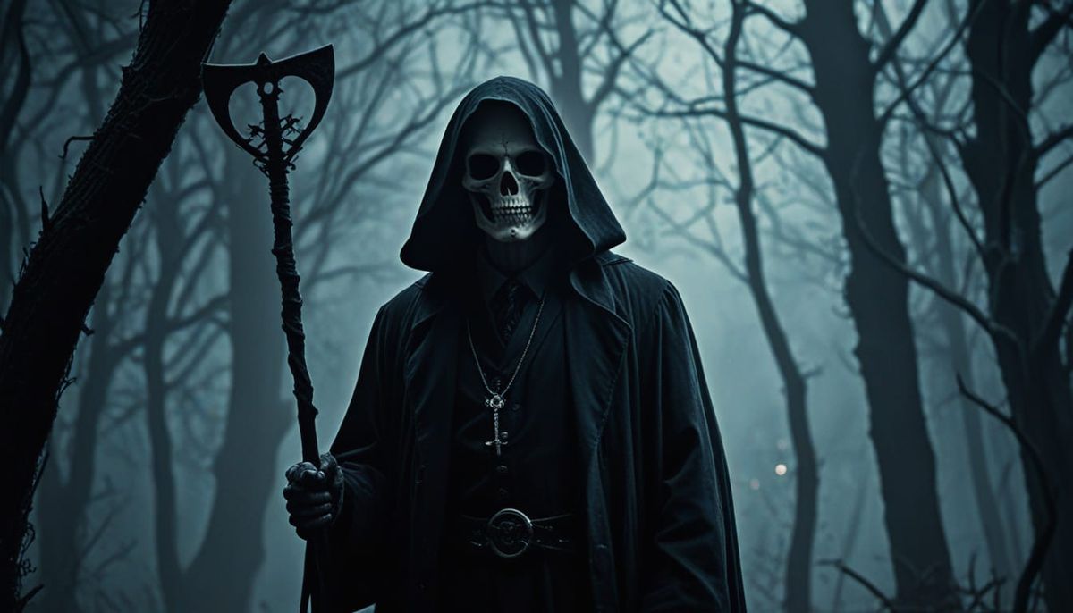 A close-up portrait of Godfather Death, a menacing figure with a scythe, set amidst a mystical, eerie forest with twisted tree branches, flickering lanterns, and glowing mushrooms, surrounded by a haunting mist in a dark, cinematic atmosphere
