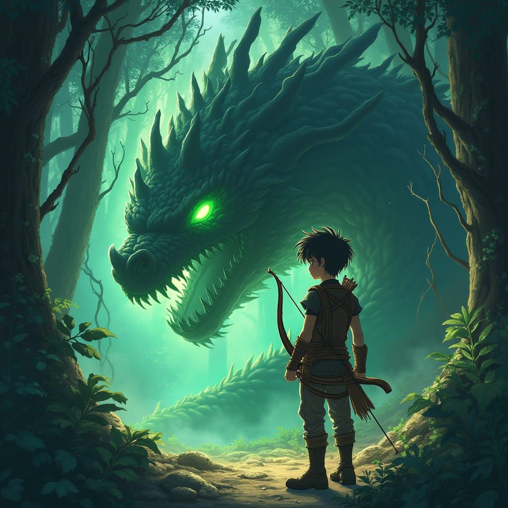 A digital painting of an anime forest guardian facing a serpent. The guardian has wooden armor, a glowing bow, and glowing eyes, standing in a cinematic forest with glowing vines.