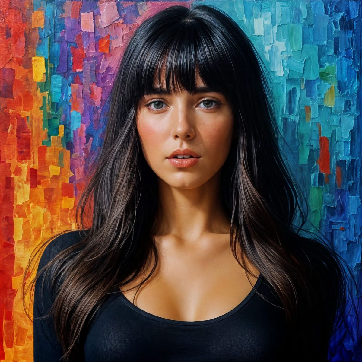 A beautiful singer sits in a modern minimalist living room, surrounded by the soft glow of volumetric lighting. Her long dark hair and skintight bodysuit exude a sense of intimacy and romance, as she sings of love and connection in a neo-impressionist style oil painting.