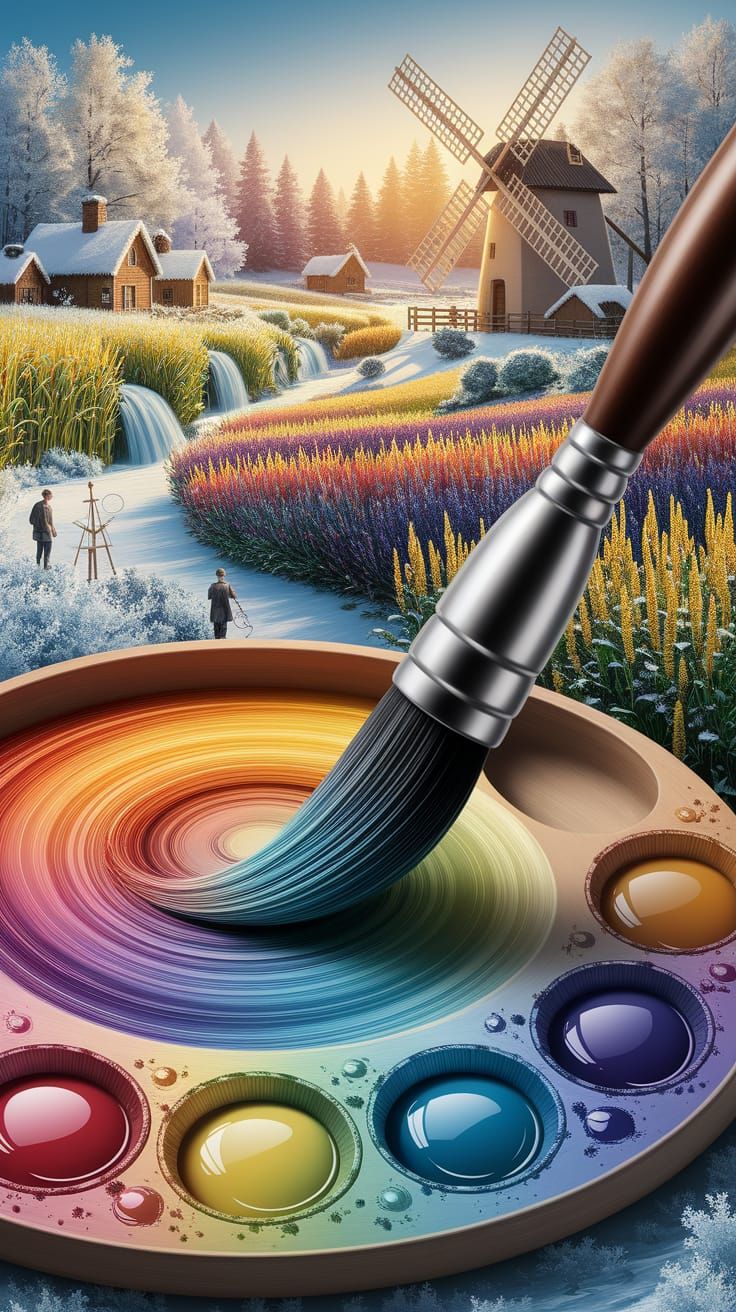 A painter's palette displays a miniature impressionist winter landscape. Tiny artists sketch the scene amid wildflowers, cornfields, waterfalls, cottages, and a windmill, all bathed in golden light as digital art.
