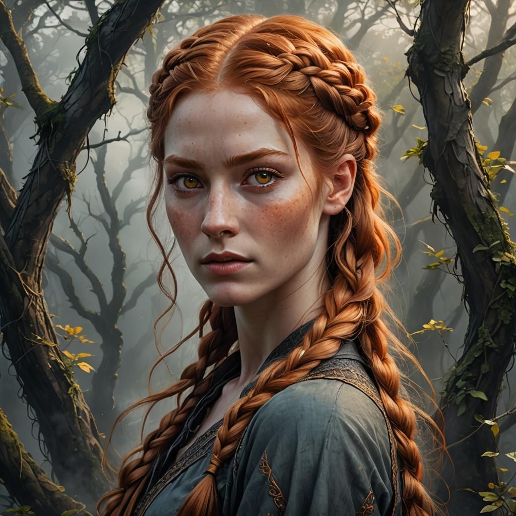 A striking picture of a slender, mystical young woman with long ginger hair braided away from her face. The digital matte painting features complementary colors and intricate details.