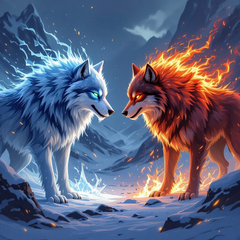 This image depicts a dramatic digital painting of an ice wolf and a fire wolf confronting each other, with contrasting elemental energies creating a dynamic visual spectacle. The art style features sharp details and dramatic lighting.