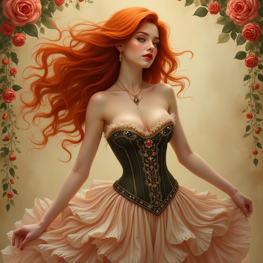 This image showcases a striking red-haired woman wearing an ornate corset dress with dramatic, outward-fanning pleated skirt panels. Rendered with soft painterly textures and ethereal lighting, it features a vintage-romantic fantasy aesthetic with couture fashion illustration details.