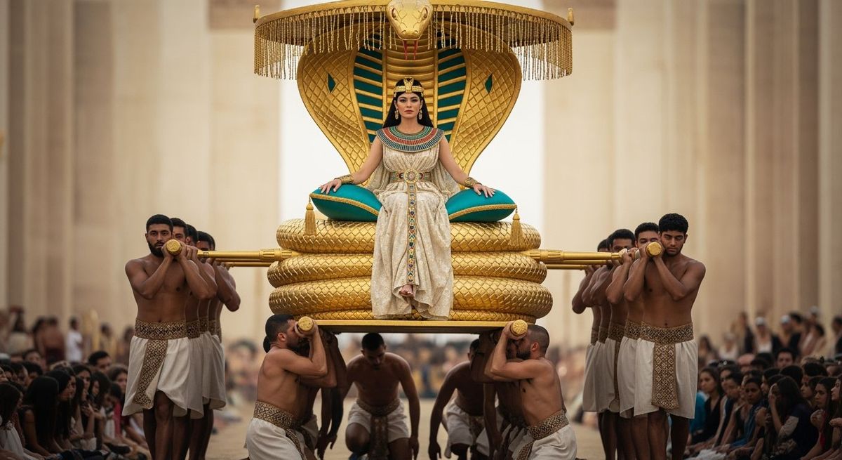 This image shows an Egyptian queen in golden robes and cobra crown being carried on a massive cobra throne. Servants bear the throne as a crowd kneels, captured with sharp focus and natural lighting.