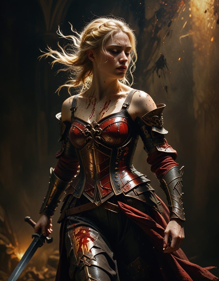 A dramatic oil painting in the style of Caravaggio, depicting an injured fairy maiden with tattered clothing and a damaged shield. Features warm golden light, deep shadows, and visible brushstrokes.