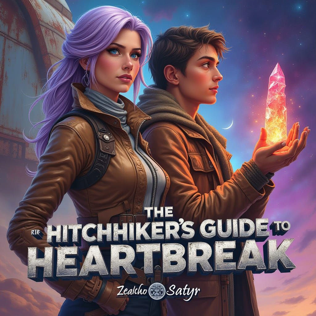 "Sci-fi romance novel cover: a rusty spaceship cuts through a purple-gold nebula. A fierce lavender-haired beautiful female pilot and a charming drifter with blue eyes stand close, hands near glowing quantum crystals. A moon shadows the corner. Title “The Hitchhiker’s Guide to Galactic Heartbreak” written in bold silver at top, ‘Heartbreak’ in cracked red. Author [Zealous Satyr] in white below. Adventurous, playful, cinematic vibe. graffiti art, splash art, street art, spray paint, oil gouache melting, acrylic, high contrast, colorful polychromatic, ultra detailed, ultra quality, CGSociety. Remove selected area"
