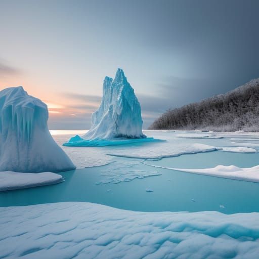 This image shows a surreal, snow-covered Maldivian beach scene in winter. Turquoise ocean waves crash against encroaching ice, forming ice caves. The scene is rendered with high detail, vibrant colors and cinematic lighting.