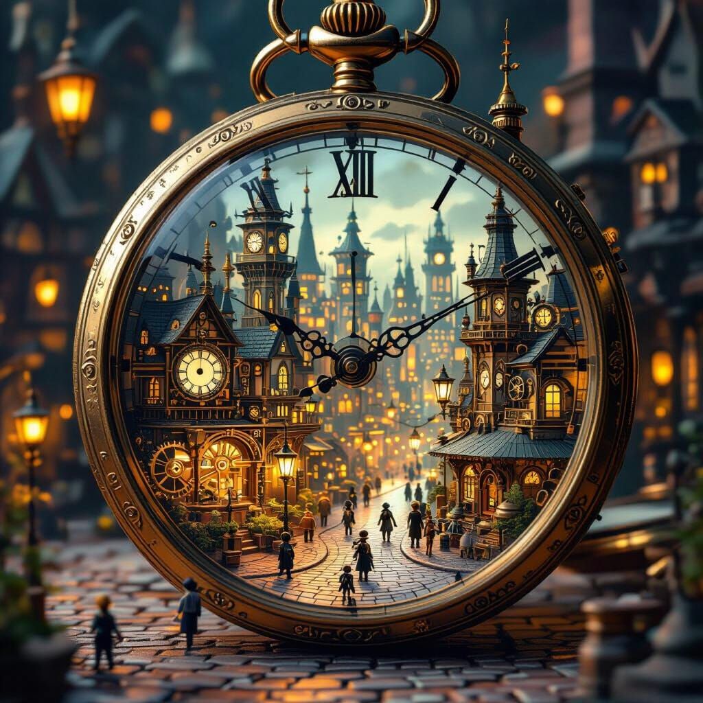 Imagine a miniature world contained within a vintage pocket watch. Inside, a bustling steampunk city unfolds with intricate gears, towering clockwork buildings, and tiny automatons scurrying about their daily lives. The scene is illuminated by the soft glow of miniature gas lamps, casting long shadows ...